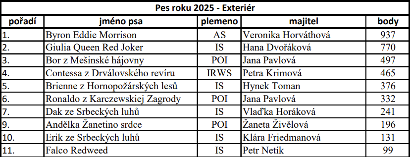 Byla ukončená soutěž Pes roku exteriér, pořádaná Českým pointer a setter klubem. Já i moje parťačka jsme nadšení, že jsem se umístil na 7 místě mezi všemi plemeny a jako 3 nejúspěšnější irský setr. Výstavy mě čekají i letošní rok, s cílem dokončit šampionáty v Polsku, Maďarsku, Slovensku a Rakousku. Držte mi palce :-)